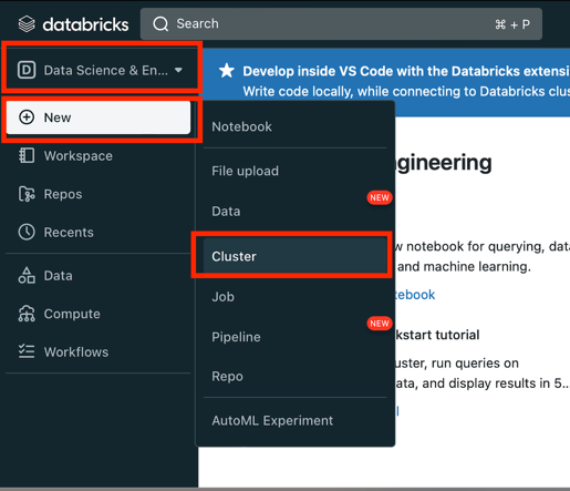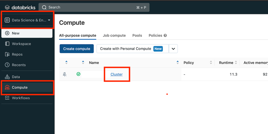 Go to Compute section under Data science & Engineering and click on cluster link: