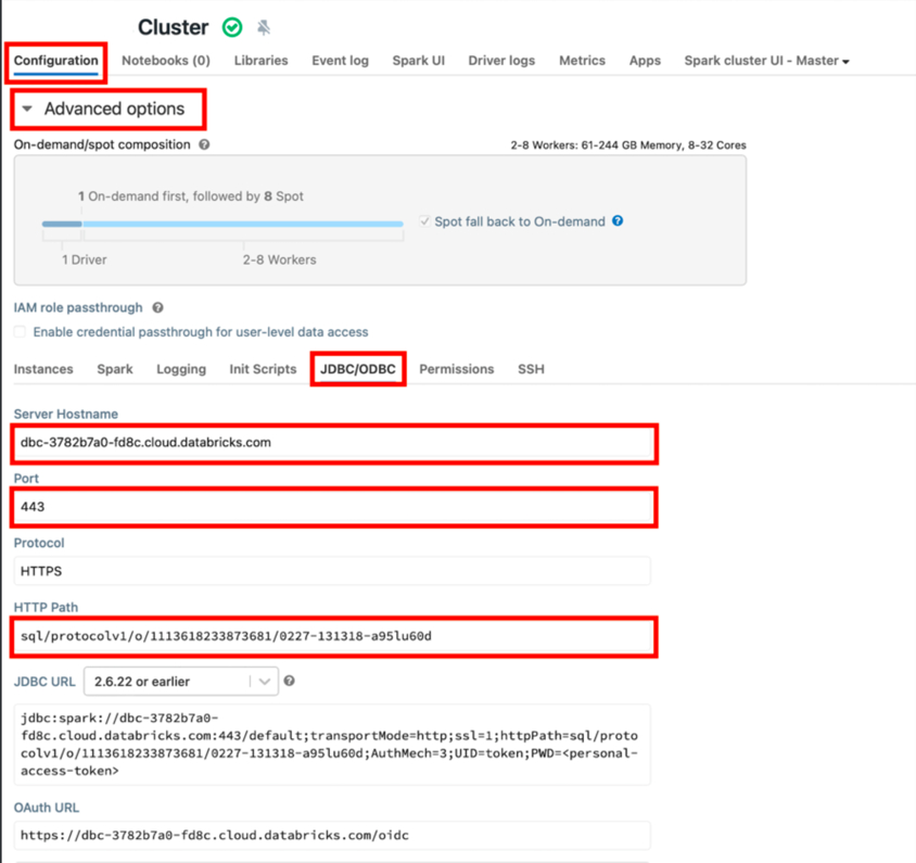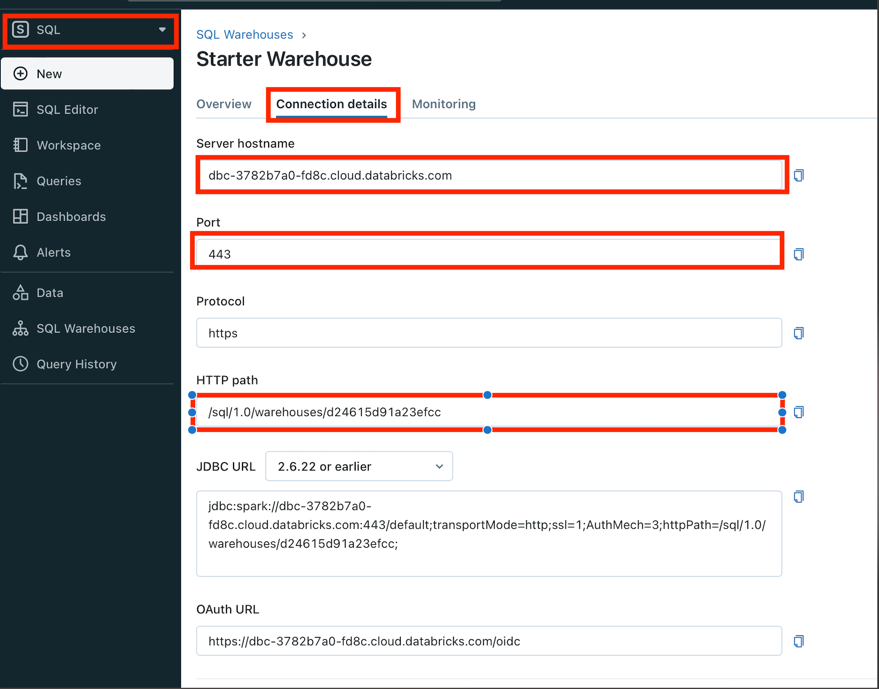 Agree to the Databricks JDBC Driver Terms & Conditions- Databricks JDBC ODBC driver license.Server Hostname- can be taken from 4. Databricks SQL Warehouse connection details or 6. Databricks Cluster connection details steps.HTTP Path- can be taken from 4. Databricks SQL Warehouse connection details or 6. Databricks Cluster connection details steps.Port- can be taken from 4. Databricks SQL Warehouse connection details or 6. Databricks Cluster connection details steps.Access Token- can be taken from 7. Create Databricks Token step.