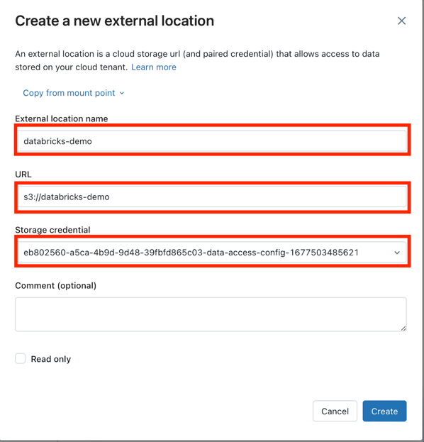 External Locationshas been added to the workspace. Check Adding External Locations step.