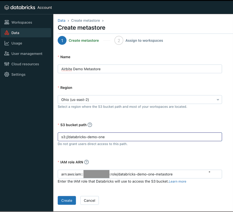 NameRegionThe metastore should be in same region as the workspace.S3 bucket pathcreated at Setup storage bucket and IAM role in AWS step.IAM role ARNcreated at Setup storage bucket and IAM role in AWS step. Example:arn:aws:iam::<AWS_ACCOUNT_ID>:role/<AWS_IAM_ROLE_NAME>