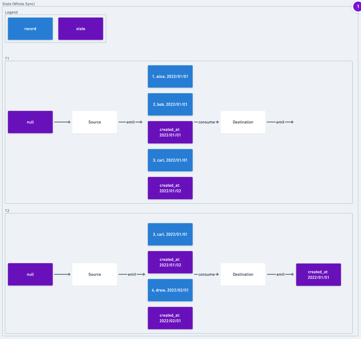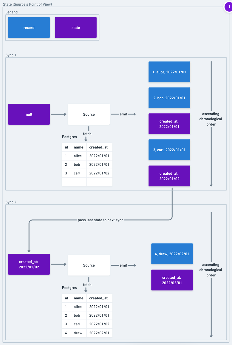 AirbyteStateMessagesin order to allow checkpointing data replication. State is described in more detail below in the State & Checkpointing section. - Only